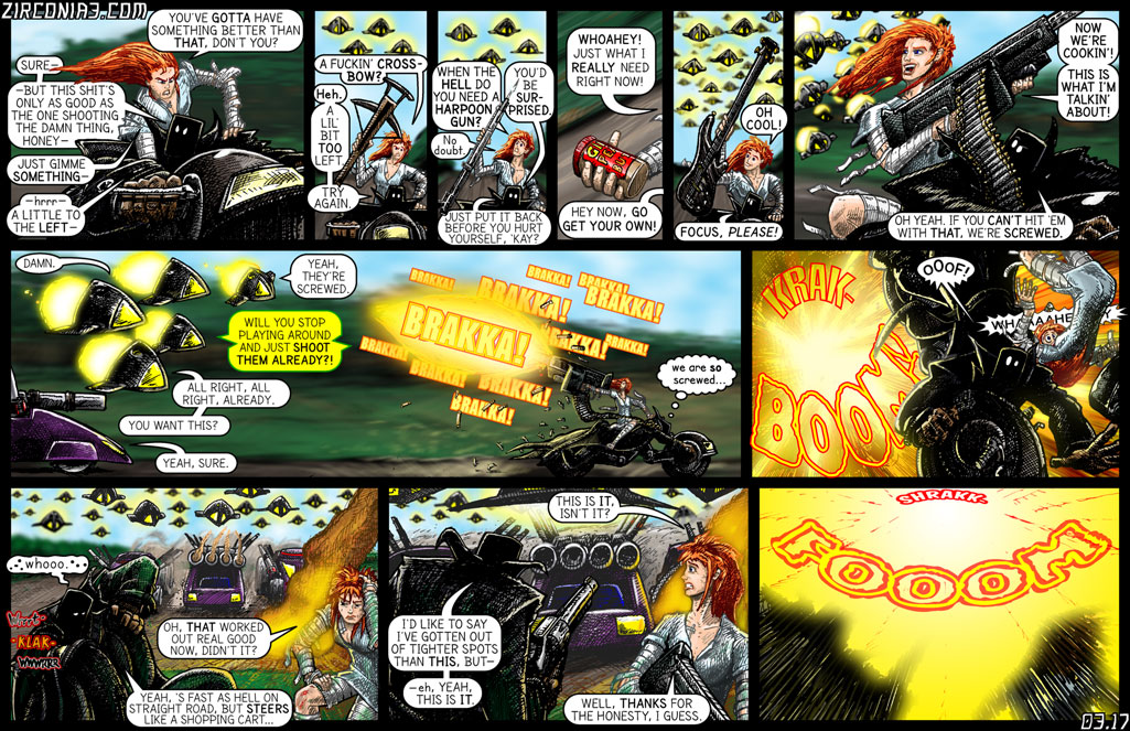 Public Service Announcement. Okay, now that we've got this running joke established, I want to make something clear: This portayal of Miss Waters' shooting skills (or lack thereof) is in no way intended to be any sort of sexist all-girls-can't-shoot generalization. This is one character, who has this almost-supernatural inability to successfully aim a gun, and is female. I have a superhero name for her that will be established later, which fits nicely with her "jinx". This was all inspired by Misfire, a decepticon with a similar reputation with firearms. At least in Alison's case, she has the skills and wits and guts to work around that one shortcoming.